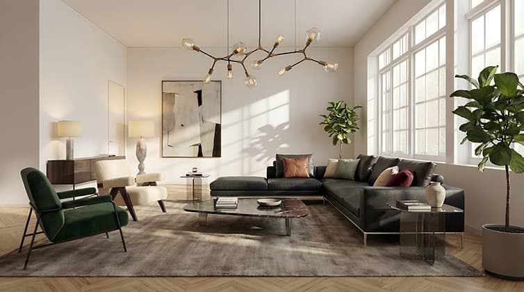 空室写真を家具入りのお部屋にコーディネートして画像を作成いたします。タイプはラグジュアリー、北欧風、シンプルモダンからお選び頂けます。